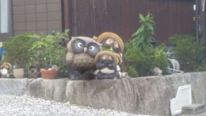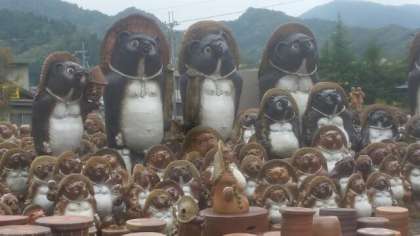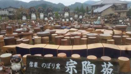 タヌキの置物で有名な信楽焼、お家の軒先にもタヌキがいます。陶芸教室をしていただく宗陶苑に到着しました。人の背丈の倍ほどあるタヌキの置物がところ狭しと置かれています。