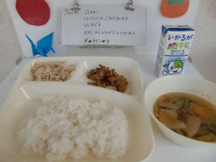 今日の献立は、【ごはん、鶏肉のごまだれ焼き、ソーキ汁、もやしのしょうがじょうゆあえ、牛乳】でした。