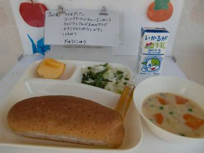 10月26日の給食 公開日 2018/10/26 更新日 2018/10/26 お知らせ 今日の献立は、【ライ麦パン、コーンクリームシチュー[米粉]、キャベツと三度豆のサラダ、かき(平核無柿)、牛乳】でした。 柿は1000種類もあるといわれていますが、「甘柿」と「渋柿」に分けられます。今日の給食に登場したのは、「平核無柿(ひらたねなしがき)」といって、渋柿ですが渋抜きをした甘い柿でした。 いいね(0)