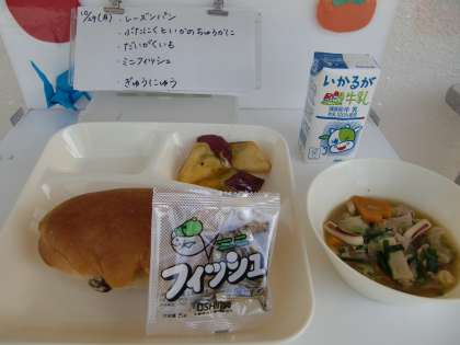 10月29日の給食 公開日 2018/10/29 更新日 2018/10/29 お知らせ 今日の献立は、【レーズンパン、豚肉といかの中華煮、大学いも、ミニフィッシュ、牛乳】でした。 豚肉といかの中華煮は、豚肉といかのほかに、キャベツ、たまねぎ、にんじん、たけのこ、にらと具だくさんでした。でんぷんでとろみをつけていたので、体が温まる一品でした。 大学いもは、乱切りにしたさつまいもを素揚げし、砂糖、塩、こい口しょうゆで作ったみつをからめます。児童にとても好評でした。 いいね(0)