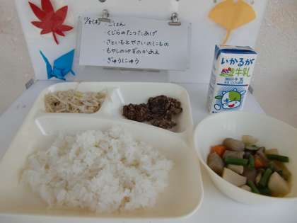 11月8日の給食 公開日 2018/11/08 更新日 2018/11/08 お知らせ 今日の献立は、【ごはん、くじらのたつたあげ、さといもと野菜の煮もの、もやしのゆずの香あえ、牛乳】でした。 くじらは1年に1回だけ登場します。しっかり下味をつけてから揚げてあったので、ごはんによく合いました。1年生から「くじらっておいしいんや!」という感想が聞けました。 いいね(0)