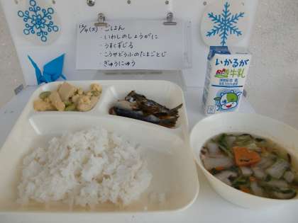 今日の献立は、【ごはん、いわしのしょうが煮、うすくず汁、高野どうふの卵とじ、牛乳】でした。