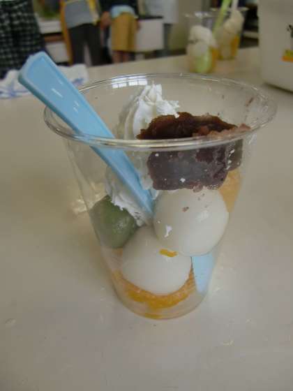 トッピングは、あんこ、フルーツ缶詰、ホイップクリームで、班のみんなで相談しながら、きれいに盛り付けていました。