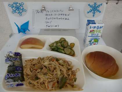 今日の献立は、【1/2黒糖パン、オイスターソース焼きそば、きゅうりの中華あえ、りんご、牛乳】でした。