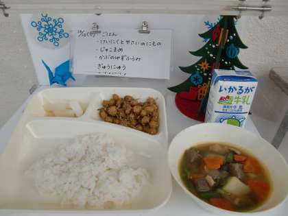12月10日の給食 公開日 2018/12/10 更新日 2018/12/10 お知らせ 今日の献立は、【ごはん、鶏肉と野菜の煮もの、じゃこ豆、かぶのゆず風味、牛乳】でした。 じゃこ豆は、大豆にでんぷんをまぶして油で揚げ、砂糖、こい口しょうゆを煮つめたたれをちりめんじゃこと一緒に大豆にからめて、最後にいりごまをふって作ります。大豆とちりめんじゃこというかみごたえのある組み合わせでで、自然とかむ回数が増える献立でした。 いいね(0)