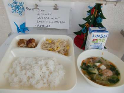 今日の献立は、【ごはん、あげシューマイ、えびととうふのスープ、もやしとコーンのピリ辛あえ、牛乳】でした。