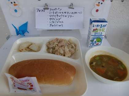 今日の献立は、【コッペパン、ミートボールと野菜のカレー煮、ツナとキャベツのソテー、焼きじゃが、いちごジャム、牛乳】でした。
