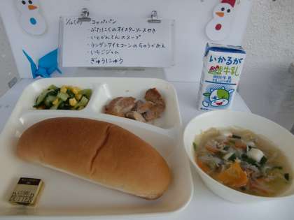 今日の献立は、【コッペパン、鶏肉のオイスターソース焼き、糸寒天のスープ、チンゲンサイとコーンの中華あえ、バター、牛乳】でした。