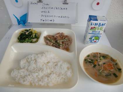 今日の献立は、【ごはん、豚肉のごまだれ焼き、みそ汁、きくなとはくさいのおひたし、牛乳】でした。