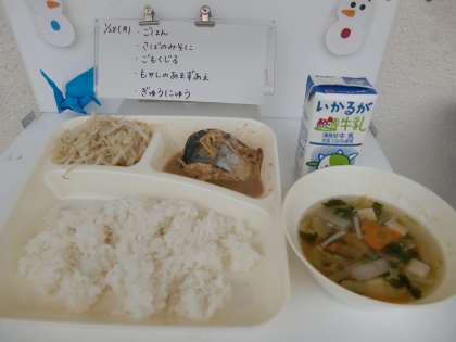 今日の献立は、【ごはん、さばのみそ煮、五目汁、もやしの甘酢あえ、牛乳】でした。