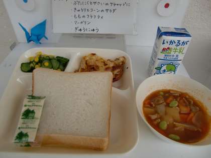 1月29日の給食 公開日 2019/01/29 更新日 2019/01/29 お知らせ 今日の献立は、【食パン、豚肉と野菜のケチャップ煮、きゅうりとコーンのサラダ、桃のクラフティ、牛乳】でした。 桃のクラフティは、コーンフレークの土台に、卵、クリーム、砂糖、小麦粉、白桃で作った生地を流し込み、焼き物機で25分間焼いた手作りのデザートです。 いいね(0)