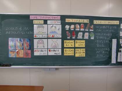 というよいことがあることをおさえ、もちやごぼうなどのかみごたえのある食べ物を食べると、自然にかむ回数が増えるということを学習しました。