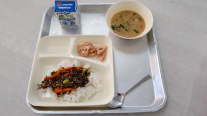 教室に戻って給食当番が配膳をして、