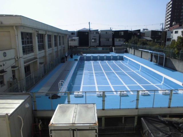 プール一面、真っ青! -通路にシートが- 公開日 2026/02/04 更新日 2026/02/04 学校行事 プールの壁面・底面の塗装のあとは、コンクリートがあらわになった通路にシートをきれいに貼っています。プール一面、色が真っ青になりました。 いいね(0)