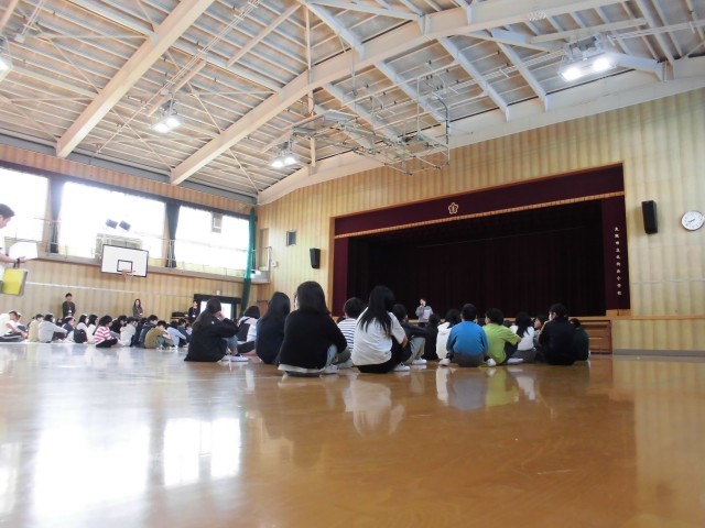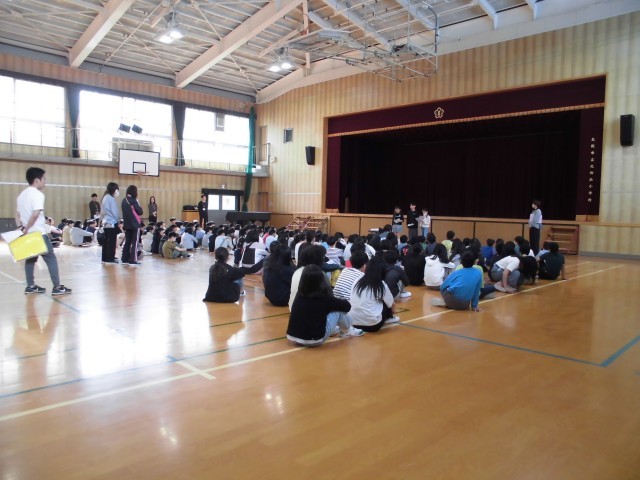 体育館に全校児童が集合して、「児童朝会」を行いました。