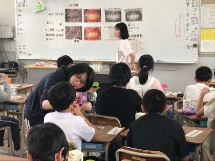 6年生に対して、歯科衛生士の方や学校医である歯科医の先生から歯の磨き方や、自分の歯で一番汚れが落ちにくい場所などを確認するお話がありました。みんな真剣に聞く事が出来ていました