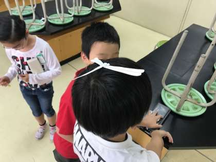 化学クラブでは紙のトンボを作成し、バランス遊びを楽しんでいます。
