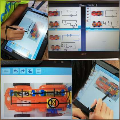 また、モーターカーの写真に重ねるように書き込み、それを移動させることで、回路図を書くのが苦手な子どもたちも、少しずつ回路図の仕組みが分かってきたようです。