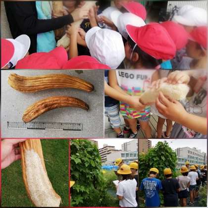 5年生が学習園でヘチマの観察をしていました。