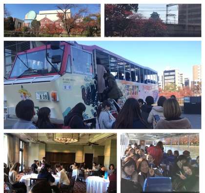 天満橋より水陸両用車での「ダックツアー」に乗船し、大阪市内を陸からと川から散策しました。お天気は最高でしたが窓の無い乗り物だったので、気温が低く冷たい風が痛いほどでした。しかし、添乗員さんのマシンガントークは、その冷たさを忘れるくらいの勢いがあり、皆さんの笑顔を誘ってくださいました。