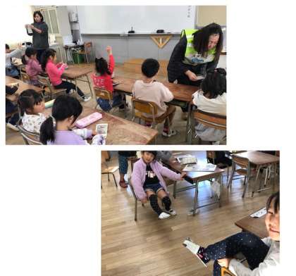 1年生は緊急時に使用する、新聞紙で作る「スリッパ」をサライブの方からご指導いただきました。