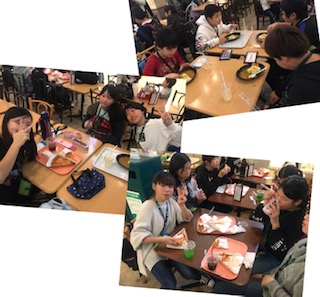 各班毎にお昼ご飯を食べています。 ピザやカレーなど、大人気のメニューばかりです。