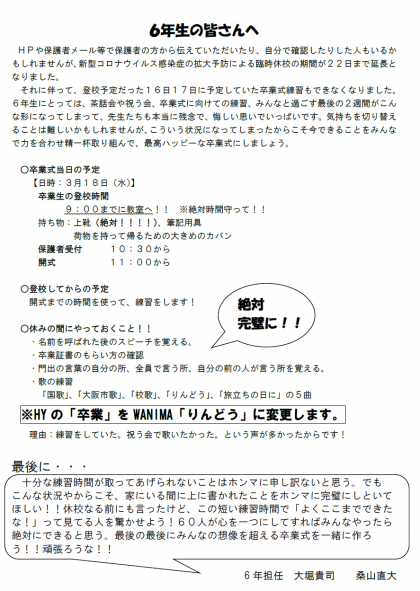 6年生の担任の先生から、卒業式についてお知らせがあります。