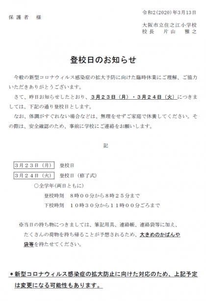 さて、昨日お知らせした3月23日(月)・3月24日(火)につきまして、本校での対応が決まりましたのでお知らせします。下の画像にてご確認いただくか、こちらをクリックしてpdfファイルをご確認ください。