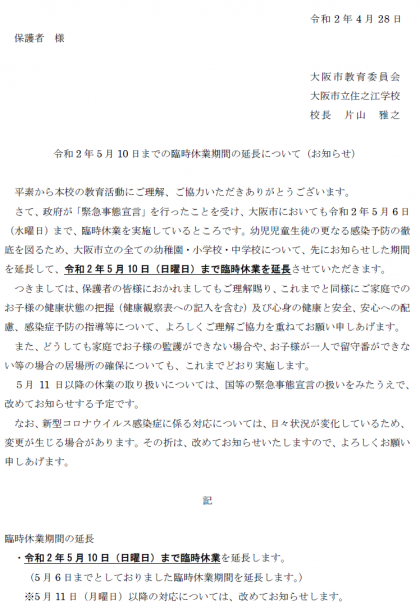 この度、大阪市教育委員会より、5月10日(日)まで休校を延長するという旨の通知が来ましたので、取り急ぎお知らせいたします。