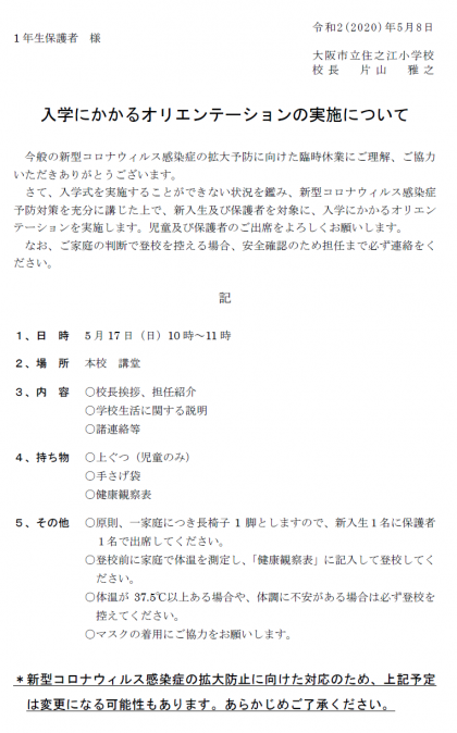【1年生対象】入学にかかるオリエンテーションの実施について