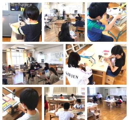 そして図工室に移動して、昨年度途中まで制作を進めていたメッセージボートをミシンノコ盤でデザインした通りにカットしていました。なかなかうまくカット出来ず、悪戦苦闘していましたが、みんな集中して取り組めました。