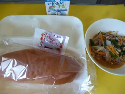 6月8日の給食は、コッペパン、牛乳、いちごジャム、マーボーはるさめ(上の写真)