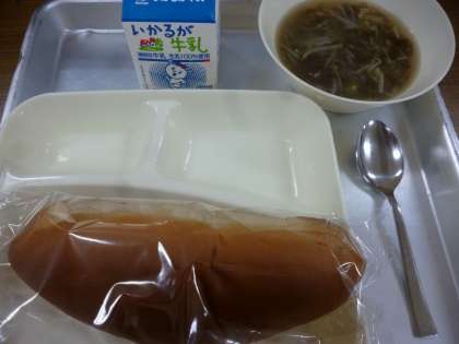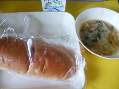 6月10日の給食は、おさつパン、牛乳、中華スープ(下の写真)です。