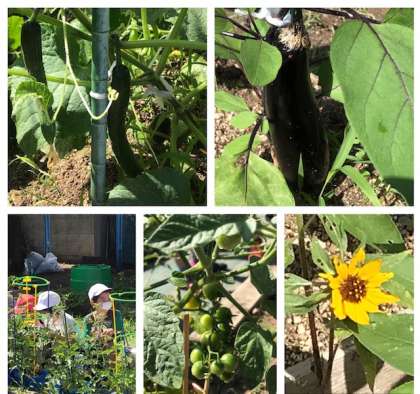 2年生がこの間大切に育てている、茄子、胡瓜、プチトマトが太陽の日差しを浴びて立派になり、収穫の時期を迎えようとしています。
