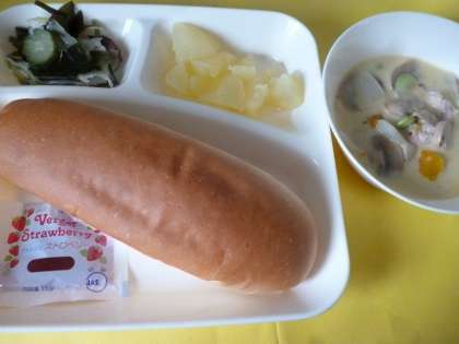 今日の献立は、コッペパン・いちごジャム・牛乳・りんご(カット缶)・かぼちゃの