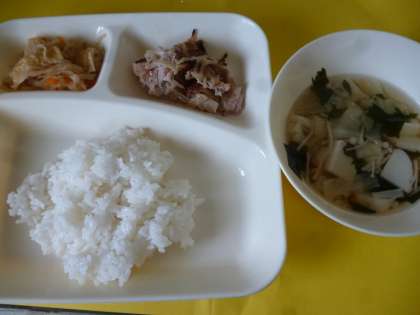 今日の献立は、ごはん・牛乳・すまし汁・豚肉の甘辛焼き・