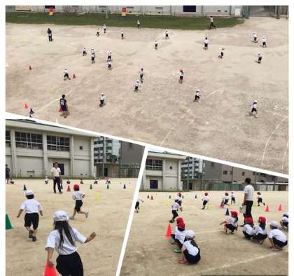 水分補給の後、目印を右に左にかわしながらジグザグに走る運動を行いました。しっかりとした体幹を作り、暑さに負けない身体作りに取組んでくれています。