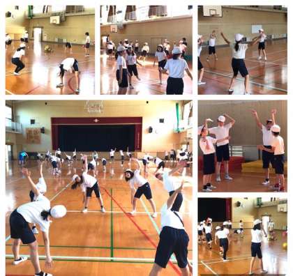 6年生の体育では講堂にてボール運動やリズム体操にと、コロナ対策を講じながら、児童が飽きないように取組んでくれています。