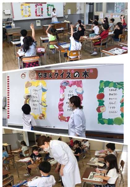 1年生の5時間目は、学校栄養職員より、給食で食べている身近な食材の名前や働きについて授業を行いました。