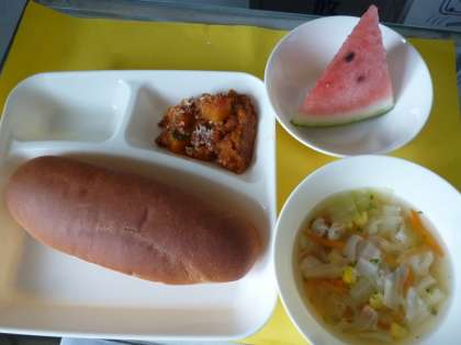 給食の献立は、こくとうパン・牛乳・すいか・かぼちゃのミートグラタン・スープで