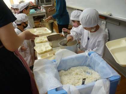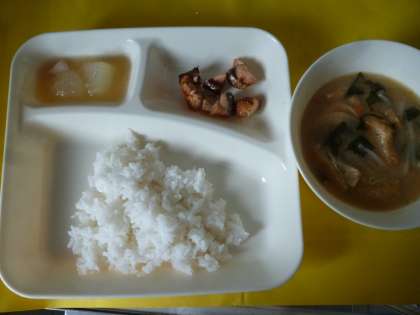 今日の献立は、ごはん・牛乳・さけのつけ焼き・みそ汁・とうがんの煮ものです。