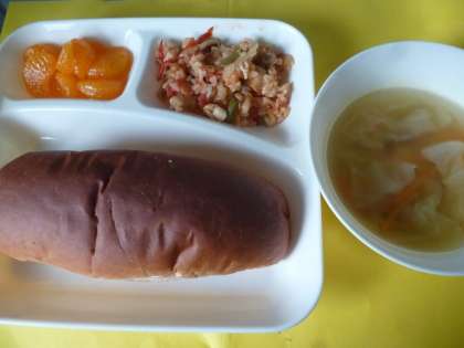 今日の給食は、こくとうパン・牛乳・みかん(缶)・パエリア・ウインナーとキャベ