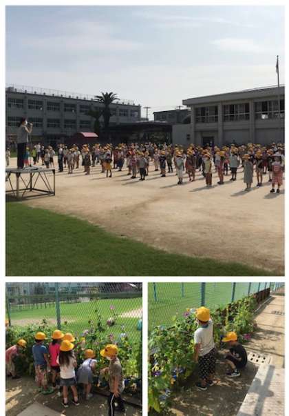 1年生が育てている朝顔も、随分と立派になってきました。こんな日は水やりも大変ですが、まだまだ大きくなるよう、愛情込めて育ててくださいね。