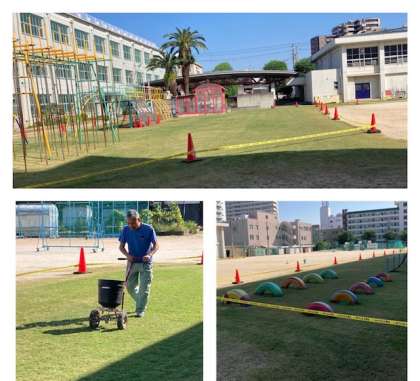 本校の自慢の1つに、運動場や遊具、鉄棒まわりに天然のクッションである芝生を張り、丁寧に育てています。
