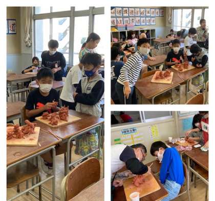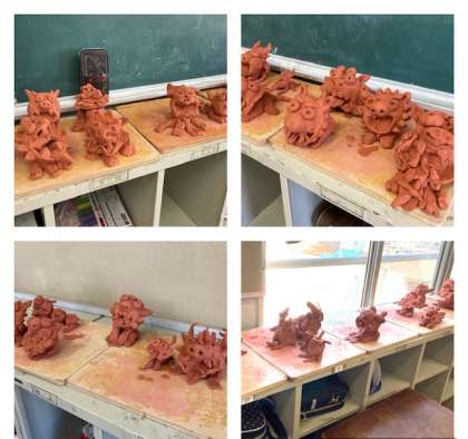 5年生では平和学習で、沖縄のことを学んでいます。その一環としで図工の時間にシーサーを作成しました。