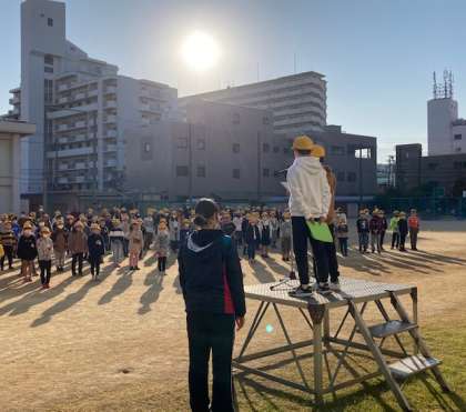 今週の始まりも、素晴らしいお天気の下、児童朝礼からスタートです。