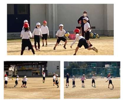 1年生の体育ではドッチボールをしています。みんなで協力して、大変盛り上がっています。