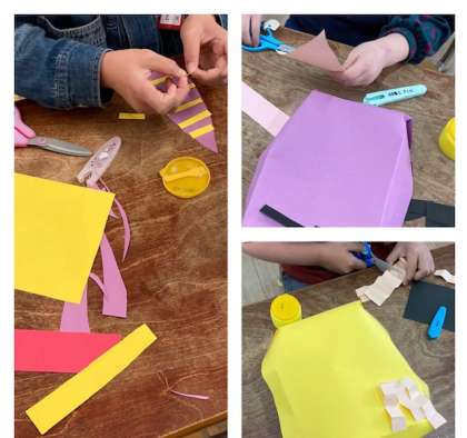 1年生はお面作りに熱中しています。それぞれ個性あふれるお面の完成を期待しています。