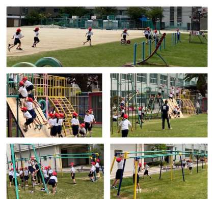 校庭にある遊具を使い、全員が楽しそうに遊びながら身体を鍛えています。