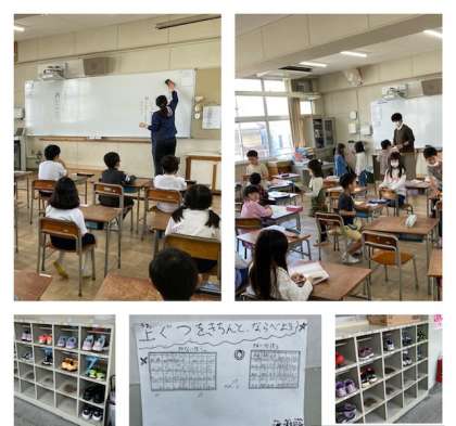 教室入り口には靴の収納棚があります。昨年度の環境委員の児童が書いてくれた約束通り、きちんと靴が並んでいました。